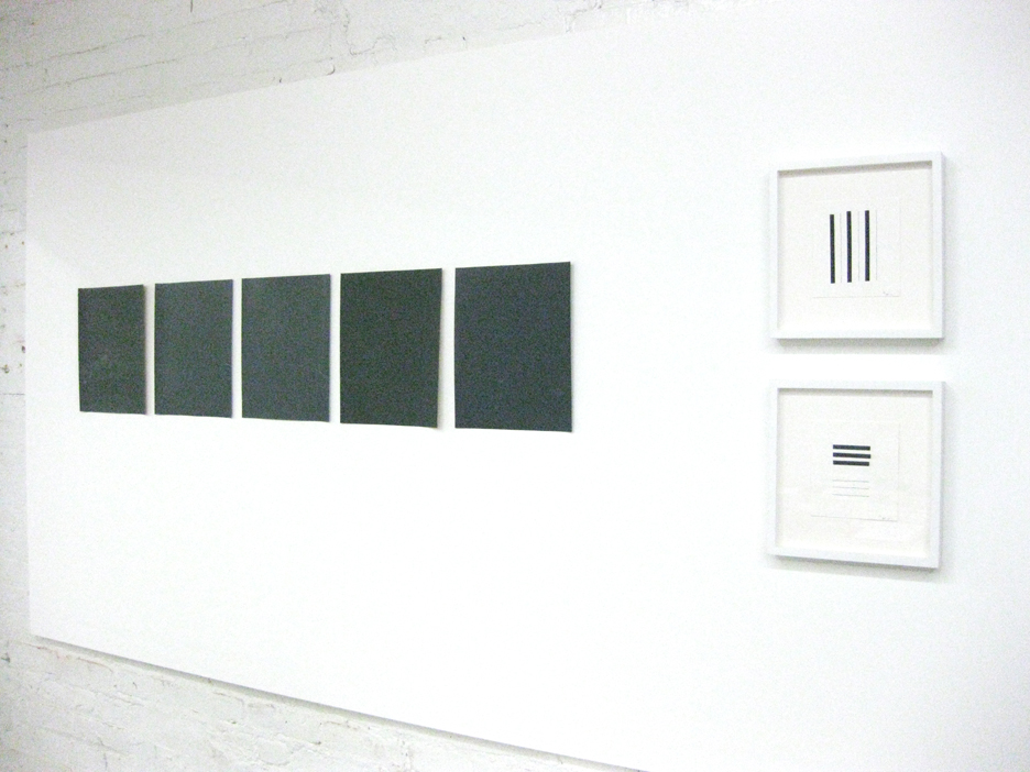The five sandpaper works were made simultaneously by rubbing the surfaces of studio walls and floor. Installed apart, the points of contiguity become clues to their former state. A certain blindness exists, in creating from behind the image, its surfaces revealing the marks of handling. The resulting graphic score-like abstractions can be seen as direct recording of its own making.