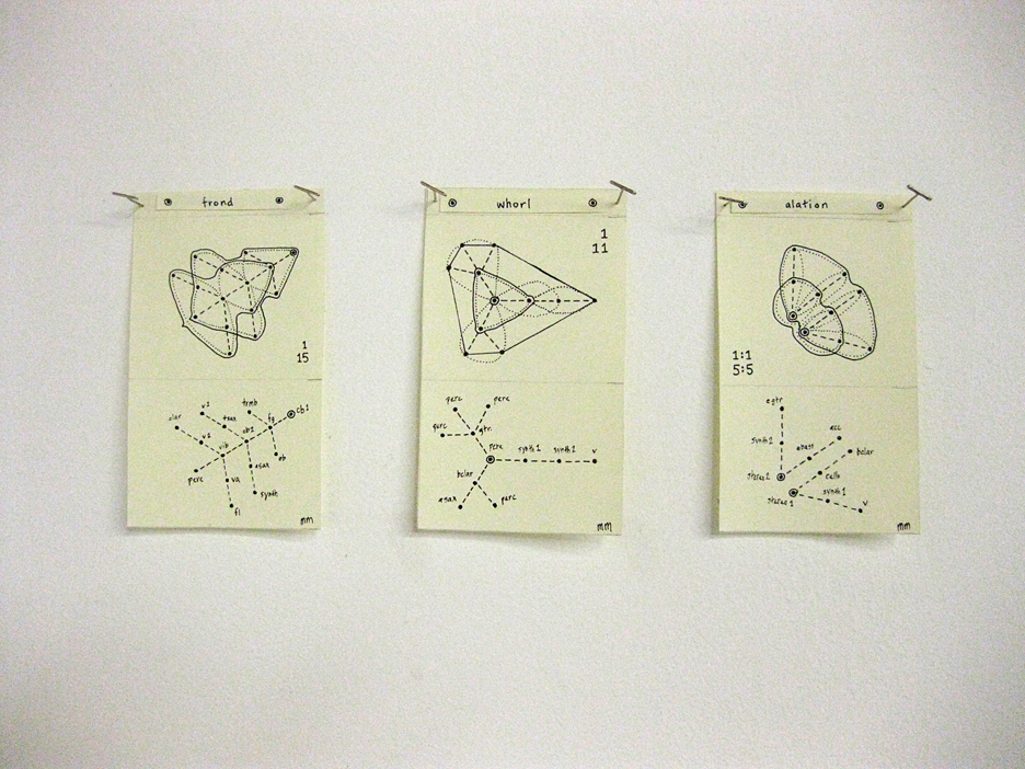 Homeomeriae is a trilogy of pieces drawn from a larger body of work (Faces of Sound). All Faces of Sound works are based on a simple chain-reaction process, as each player sonically responds to the sound of their nearest neighbor in a continuous elastic pulsation. Performers are arrayed in space into a socio-sonic geometry. The three works here – Frond, Whorl, Alation – have each taken the form of their social geometry from an aspect of plant development.